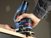 Ergonomic offset design makes this cordless 12-volt palm router easier to maneuver along workpiece edges for trimming and profiling tasks.