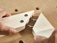 New knockdown hardware for corner and flat joints can be installed quickly and easily for project assembly with Festool’s DF 500 Q DOMINO Joiner, a specialized drilling template and bit and a hex driver.