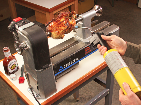 Need a Plan B when your grill’s rotisserie fails? Look no further than your lathe — and be sure to wear a face shield.