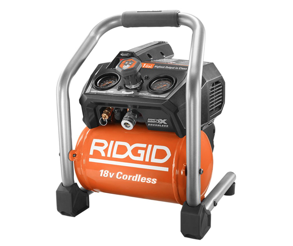 Industry-first, cordless air compressor with brushless motor and one-gallon capacity tank. Runs on one or two RIDGID 18-volt batteries.