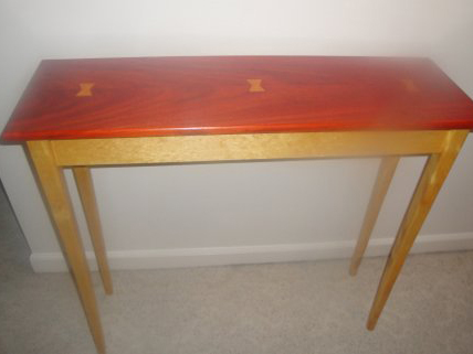 A reader combines padauk and yellowheart to create a narrow, “floating” hall table with legs that require special construction for his daughter’s entryway.