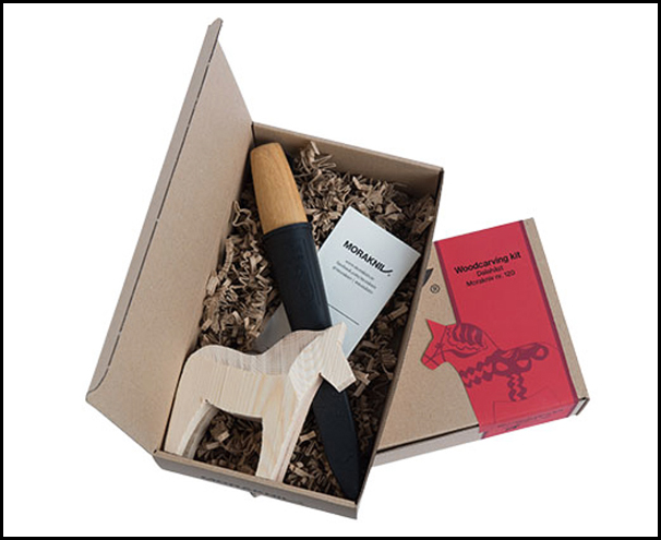 All-in-one carving kit includes knife, Dala horse blank and instructions.