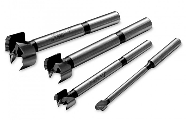 Hardened steel, serrated-edge bits with multiple shear angles cut wood cleanly and efficiently.