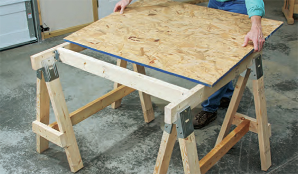 Most shops suffer from a dearth of work surfaces. Our reader tells you how to turn sawhorses into a work table for just a few dollars.