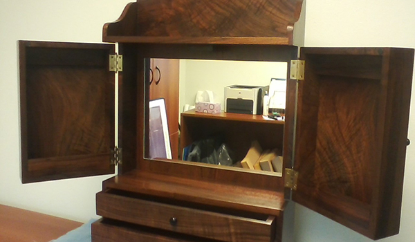 I just finished up this project for a friend at work. He provided all the rough walnut and I made it into this wall-hanging jewelry cabinet for his wife.