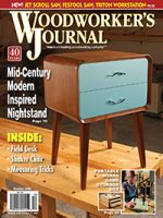 In the September/October issue of Woodworker’s Journal, you’ll find projects like a Mid-Century Modern Nightstand and 19th Century Drop Front Desk that hark back to earlier times but work just as well for today’s uses, plus get the latest news on new tools like the JET JWSS-22 Scroll Saw, Festool HK 55 Portable Circular Saw, Triton TWX7 Workcentre and NOVA 18” Voyager DVR Drill Press. And, whatever you’re building, you’ll find Sandor Nagyszalanczy’s tips and techniques for accurate measuring to be invaluable. All this, plus a Shaker Chair, a Portable Board Game Storage Box, tips on making identical turnings, and more. -