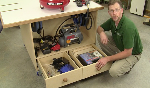 Multipurpose Outfeed Cart: This spacious rolling cart offers sturdy outfeed support for a table saw, plus serves as an all-purpose assembly bench, complete with onboard power and compressed air.
