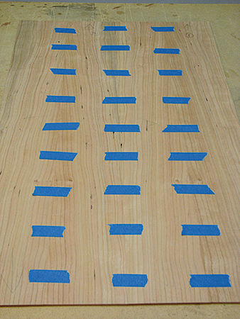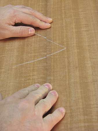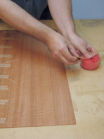 The glue should be relatively heavy but still allow the pencil lines to show through. Apply glue only to the substrate, and spray the veneers with a light mist of water right after laying them over the glue to prevent them from curling. I taped the veneer to the core with blue tape to keep it in place, making sure it protruded slightly beyond the front edge band. The rear edge and ends can be trimmed to final size later.