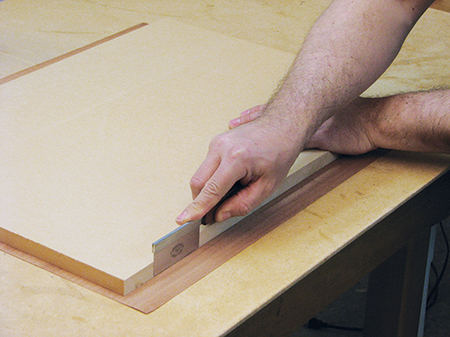 In this case, I didn’t veneer any edges, which wouldn’t be necessary when making a panel for a frame-and-panel door, for example. I also used a Baltic birch core instead of MDF, which lightens the weight and eliminates the need to sand the core material. Another suitable core material would be particleboard. Baltic birch is nicer to work with, but not as flat and consistent in thickness as particleboard and MDF.
