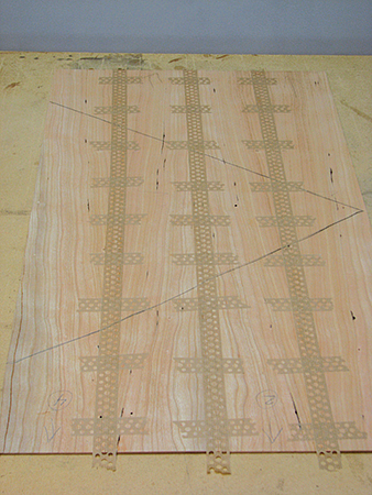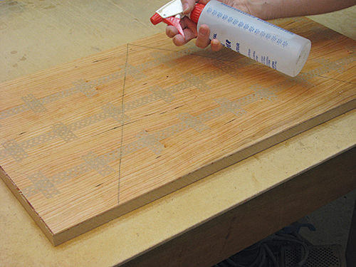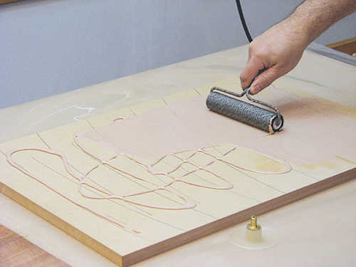 I sanded the MDF core with 120-grit sandpaper to knock off any surface glaze. This is not required when using a Baltic birch core. Then I covered the core with dark pencil lines to give me an idea of how much glue to apply with a 6″-wide glue roller.