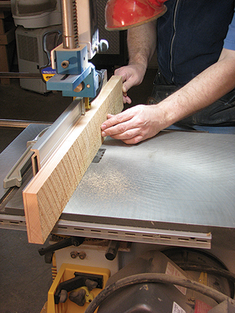 Joint one face and one edge of the stock and bring the second edge to final width with a table saw and thickness planer. Then cut a sheet of veneer off on the band saw, rejoint the face of the blank, and cut another sheet of veneer. By jumping between jointer and band saw, you can cut multiple sheets of veneer that are already smooth on one side and both edges (you’ll still need to rejoint edges before taping to get really tight joints).