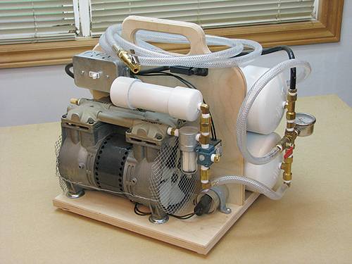 Having helped woodworking students of mine build a vacuum pump set up from a kit, I decided it was time to invest in one myself. I chose a kit with a 3.15 cfm pump, which will handle 4′ x 8′ veneer bags for flat work and 4′ x 4′ bags for moderately curved work. The kit I bought at joewoodworker.com came with all the main parts required. I simply built the wooden stand, supplied the PVC pipe and did a bit of wiring, all according to the detailed plans supplied with the kit. It resulted in a nice, tidy and mobile package.