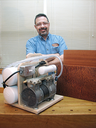 I’ve done various experiments to get around bleedthrough, which can occur when the vacuum pressure forces glue right through the veneers, interfering with stains and finishes. From my experiments, I’ve had great success setting the vacuum pressure to just 17 Hg (inches of mercury) for the first 10 minutes and then increasing it to 21 Hg for another 30 to 40 minutes. For more porous veneers such as burls, it’s best to use a powdered plastic resin glue, which really reduces bleed-through.