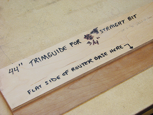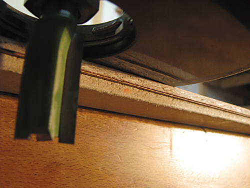 When using two or more pieces of veneer to cover a substrate, their aligning edges must be perfectly straight to avoid gaps (like a butt joint in thicker stock). I started by jointing the mating edges of the sheets I had cut from the larger original sheet using a common flush-trim router guide.