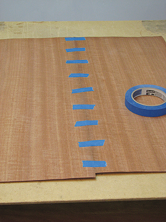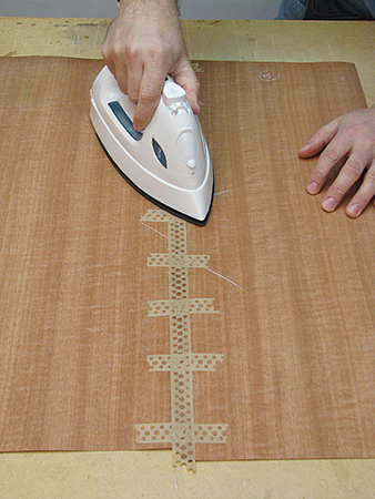 After jointing the edges, I secured the veneers together using blue tape placed across the joint every few inches on the back side. Then I applied veneer tape on the front side, first across the joint and then one long piece along the joint.